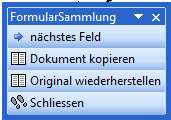 nächstes Feld: Über diese Funktion erreichen Sie das nächste zum Ausfüllen vorgesehene Feld. Im Muster sind Felder durch „____“ gekennzeichnet. Diese Feldmarkierung wird automatisch gelöscht und der Einfüge-Modus eingeschaltet, sodass Sie sofort mit dem Ausfüllen beginnen können.