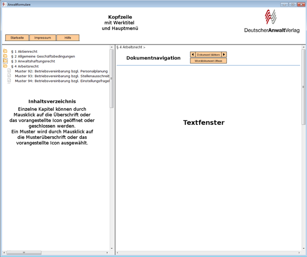 Der Formularbrowser stellt Ihnen sämtliche im Buch enthaltenen Muster zur Verfügung. Sie haben die Möglichkeit, durch Blättern oder Navigieren im Inhaltsverzeichnis ein bestimmtes Muster auszuwählen und dieses dann in Ihrer Textverarbeitung weiter zu bearbeiten. Für einige der Funktionen des Formularbrowsers benötigen Sie Word 2003 oder 2007/2010.